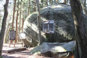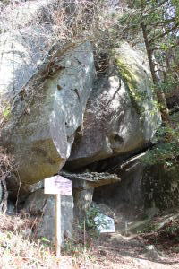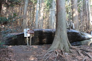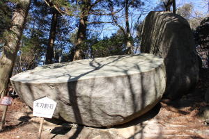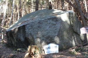 竪破山は日立市の北西端に位置する、標高658.3mの日立市で1番高い山です。山頂には茨城県名起源説話に登場する黒坂命をまつった黒前神社があり、その周辺には八幡太郎義家が太刀で割ったとされる太刀割石や船石・甲石・胎内石・畳石・烏帽子石・不動石が散在します。これらの石は山中の滝とともに、徳川光圀(水戸黄門)が「三滝七奇石」として選定したといわれています。また山頂には、幹周り3m弱の巨樹を含むブナの自然林が広がります。