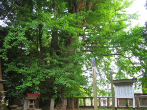 大久保町の鹿島神社には「駒つなぎのイチョウ」と呼ばれる大きなイチョウの木があります。このイチョウは、県の天然記念物に指定されており、目の高さの幹の太さが約5.6m、樹高は約20mで、樹齢は550年以上と推定されています。
